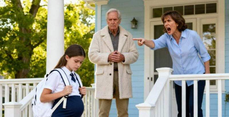 Una ragazza giovane — appena quattordicenne — stava sulla soglia, stringendo uno zainetto al petto. Le lacrime si mescolavano all’acqua della pioggia sul suo viso pallido.