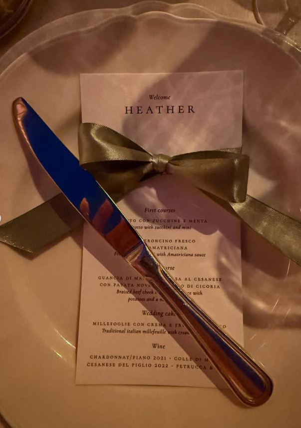 Cucina italiana per gli sposi e i loro invitati. Dopo un ricco aperitivo a buffet, gli ospiti hanno continuato la cena con un risotto con zucchine e menta e con un’amatriciana. Per secondo, guancia di maiale al Cesanese con patate novelle e cicoria. Infine il dolce, una tradizionale torta millefoglie. Ad accompagnare il tutto, uno Chardonnay/Fiano del 2021 e un Cesanese del Piglio 2022.