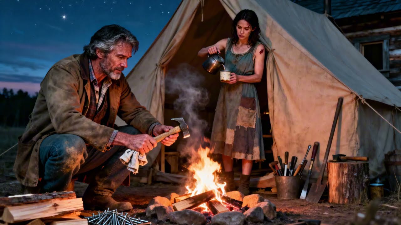 La plupart des femmes auraient abandonné depuis longtemps, mais elle avançait, déterminée. Jacob descendit doucement de cheval, la demi-cabane en construction apparaissant entre les pins. Les murs à peine à hauteur de poitrine, sans toit, entourés d’outils éparpillés et de bois fraîchement coupé. Une tente en toile affaissée se tenait à côté, fumée s’élevant d’un feu modeste.