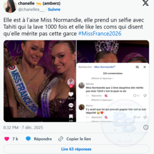 Cependant, si Miss Aquitaine et Miss Provence ont été au centre de l’attention, ce ne sont pas les seules à avoir suscité des réactions après l’élection. Victoire Dupuis, Miss Normandie, a également fait parler d’elle, mais pour des raisons un peu différentes. Après avoir publié une photo avec la nouvelle Miss France, elle a été accusée d’avoir liké plusieurs commentaires sur les réseaux sociaux affirmant qu’elle méritait de remporter le titre. Les internautes ont rapidement remarqué ce geste et l’ont interprété comme un signe de mécontentement ou de manque de soutien envers Hinaupoko Devèze. Certains ont critiqué cette attitude, suggérant qu’elle était une manière indirecte de remettre en question le résultat de l’élection. D’autres, cependant, ont pris sa défense, estimant qu’elle avait simplement agi par plaisir ou sympathie, sans arrière-pensée malveillante.